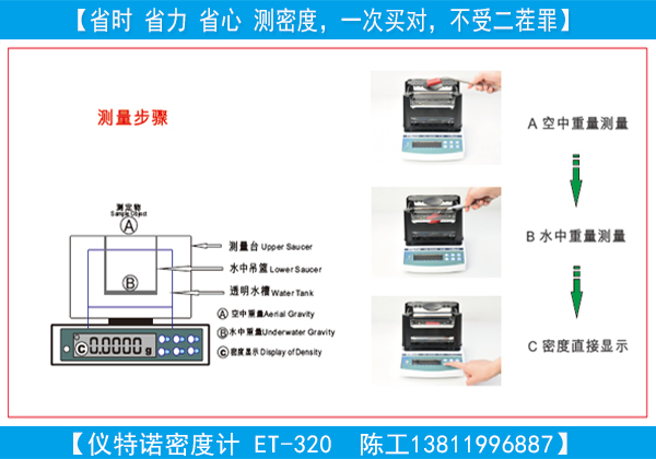 那么怎么能夠快速、省時(shí)省力的測(cè)量塑膠制品的密度呢?采用儀特諾ET-320密度測(cè)試儀,2個(gè)步驟即可直接數(shù)字顯示塑膠制品的密度結(jié)果,測(cè)試方法如下圖: